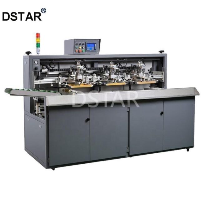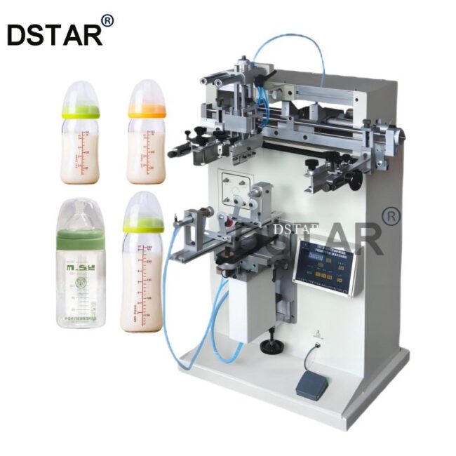 Product:Cylindrical bottle printing machine paper cup screen printer,curved screen printing machine for plastic cups Model:DX-300 Printing color:1 color Maximum printing size:Ф90×250mm 260×200mm Screen printing speed:25 times/minute Power:AC220V/50Hz 60W Air supply:5-7 Bar Machine size: L96*W90*H138cm N.W:120KGS Packing: wooden case Printing consumables What is bottle printing? Screen printing (Commonly referred to as Silk Screen Printing),is one of the most popular bottle decorating techniques in the packaging industry.Unlike a label, screen printing is a form of decoration where ink is directly printed onto a container.The ink is forced through a mesh screen and is then printed onto the bottle by a squeegee. Once the ink is applied, it is cured under UV or LED lights to ensure the ink sticks to the bottle and will not smear or rub off. DSTAR Machine has numerous screen printing machines that are capable of printing multi colors,which allows your clients to be very creative with their artwork.Our team will guide you through the entire screen printing process to help ensure that you’re delighted with the final result. The Artistic Brilliance of…