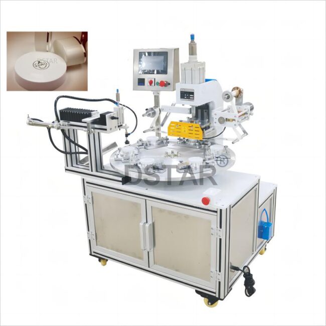 Plastic bottle cap top hot foil stamping machine with rotary workbench